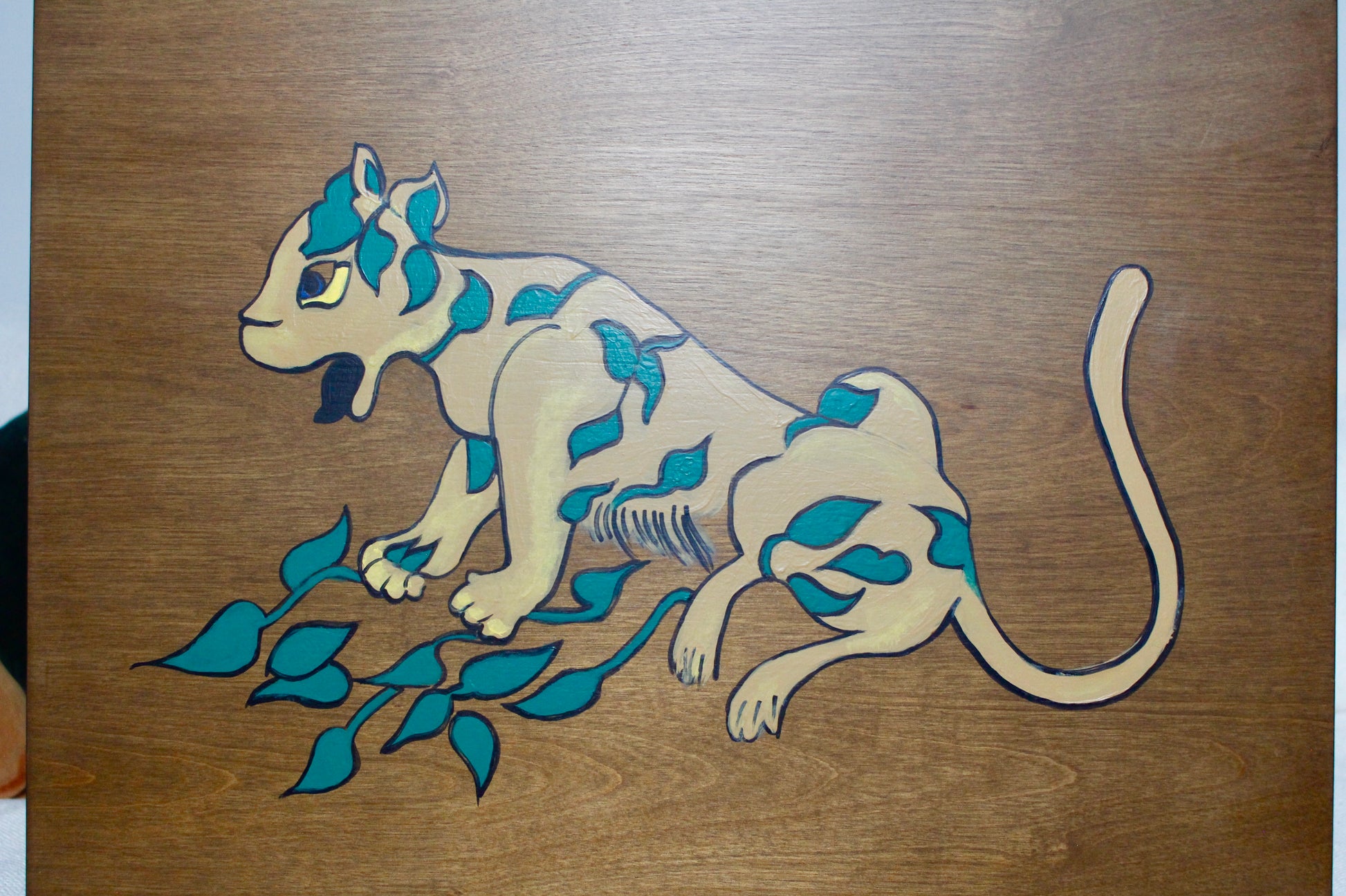A vintage maple wood side hand-painted with a tiger, its stripes formed by intertwining leaves. Inspired by Timurid Persian art, evoking the legendary Babur, the “Hidden Tiger” blends camouflage and majesty into a distinctive statement piece.